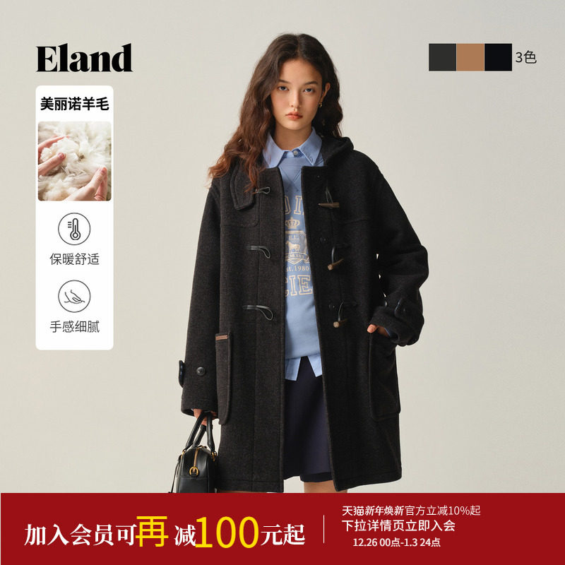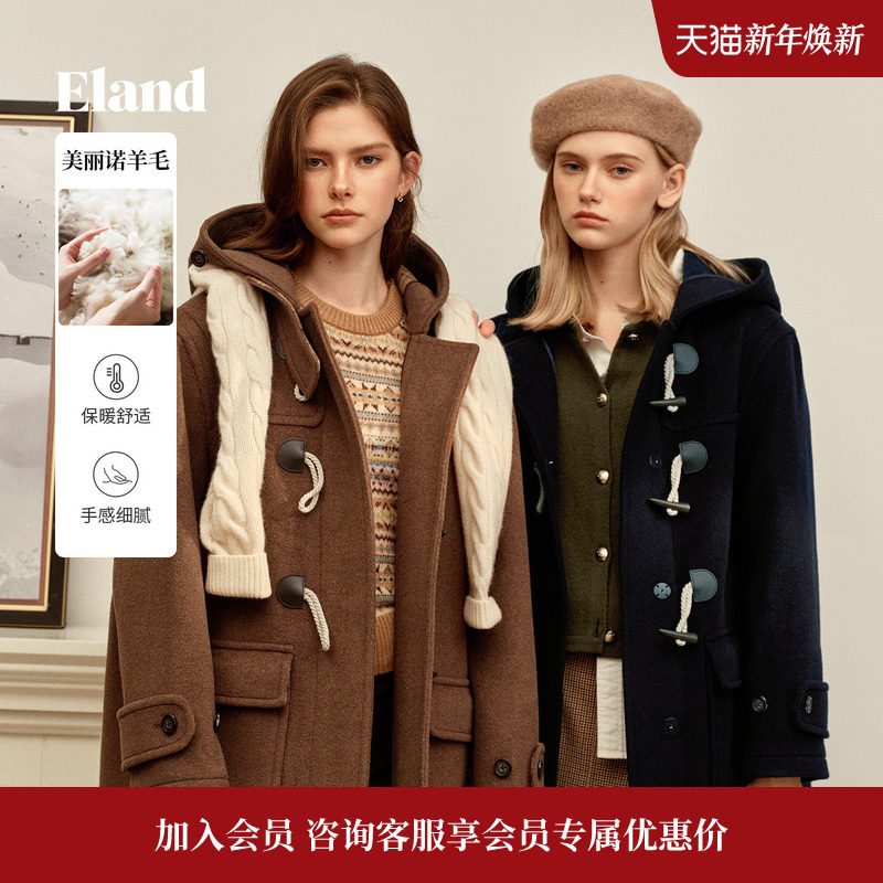 【经典长期主义】Eland衣恋毛呢外套女牛角扣羊毛大衣2025冬新款