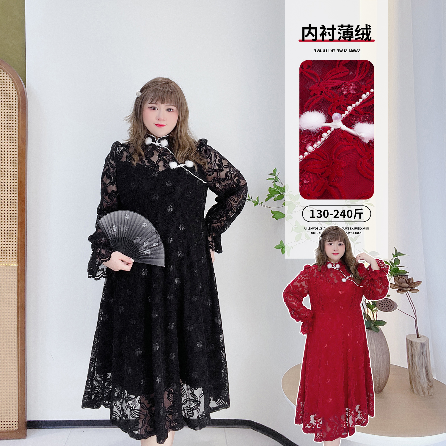 内衬薄绒甜美内搭盘扣长裙胖莹莹大码女装胖mm国风蕾丝显瘦连衣裙