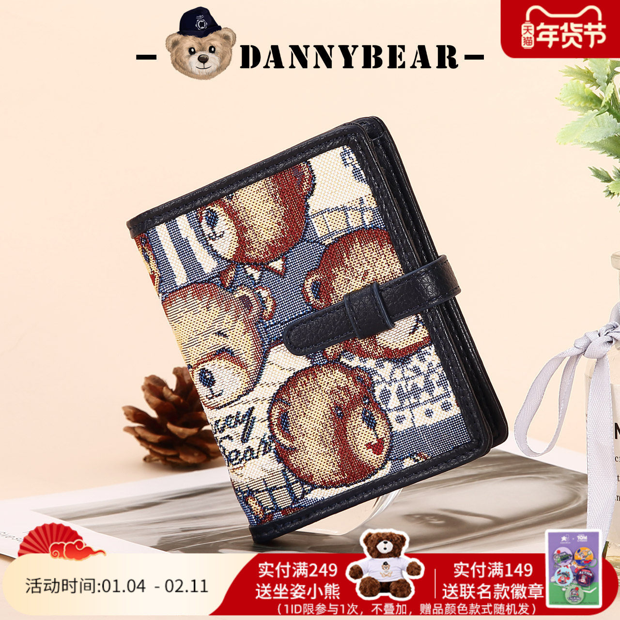 丹尼熊两折短款钱包小众钱夹女钱包针织手绘小熊布零钱包3822003