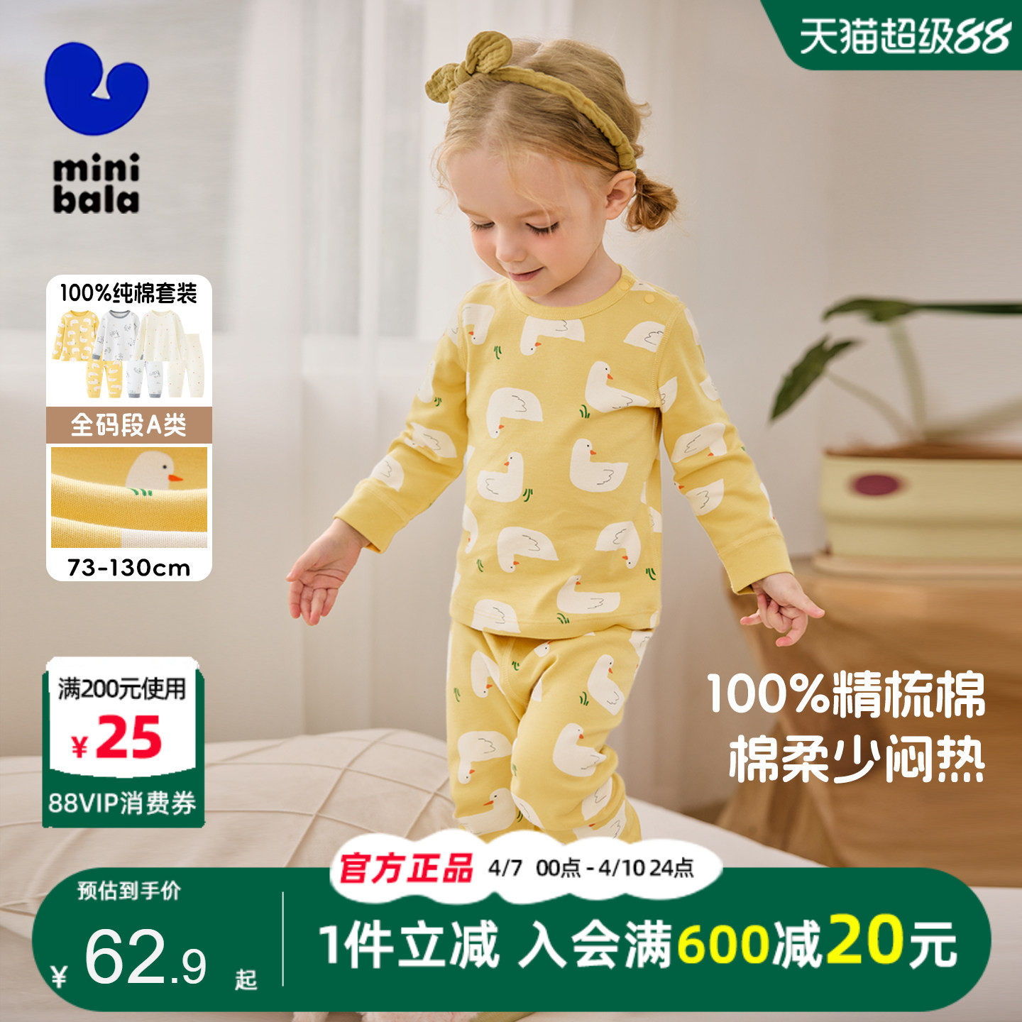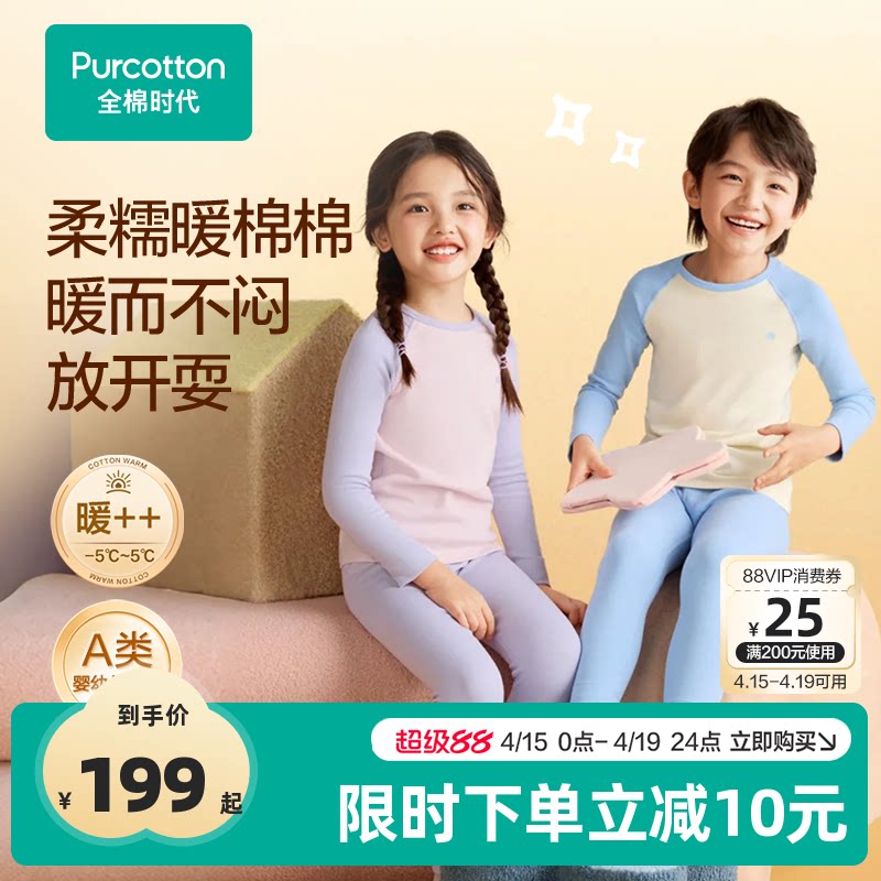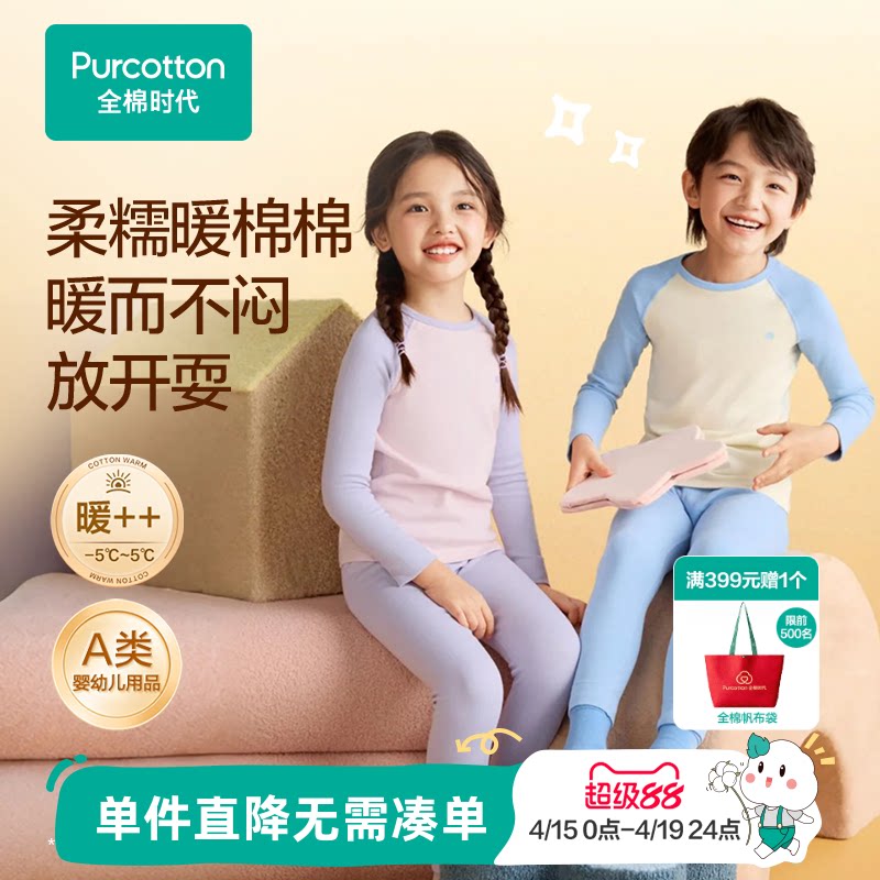 全棉时代儿童秋冬季7A抗菌保暖内衣男女孩宝宝纯棉a类秋衣裤套装