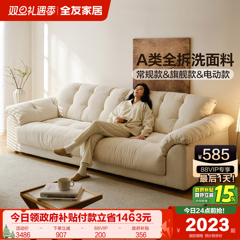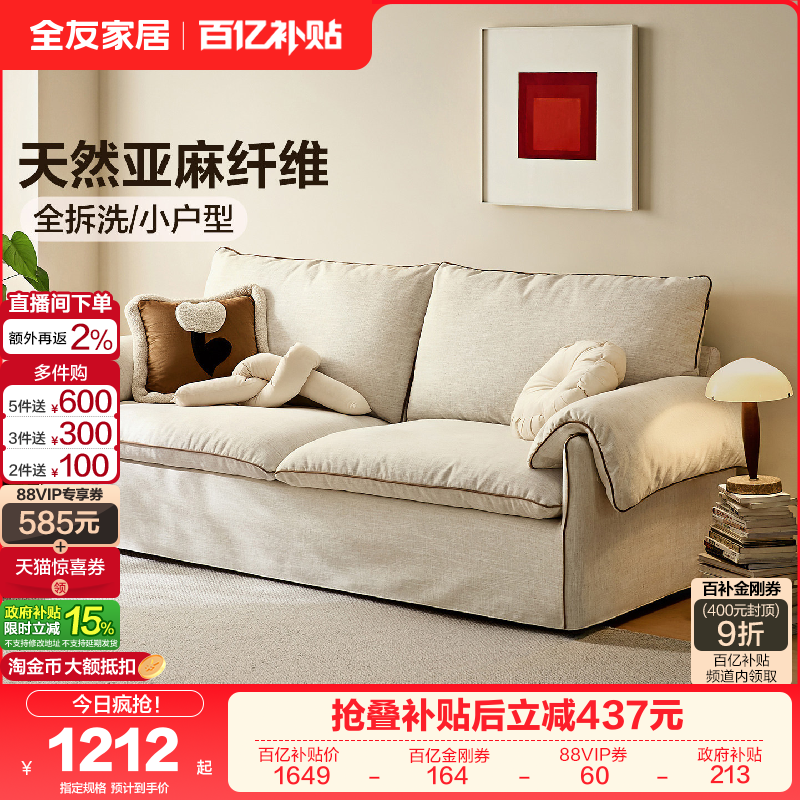 全友家居奶油风亚麻布艺沙发可拆洗小户型客厅复古风落地直排沙发