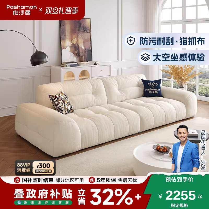 帕沙曼猫抓布艺沙发小户型现代客厅宽坐深法式奶油钢琴键沙发弧形