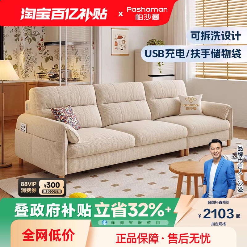 帕沙曼 布艺沙发小户型客厅原木风可拆洗沙发高靠背雪尼尔可充电