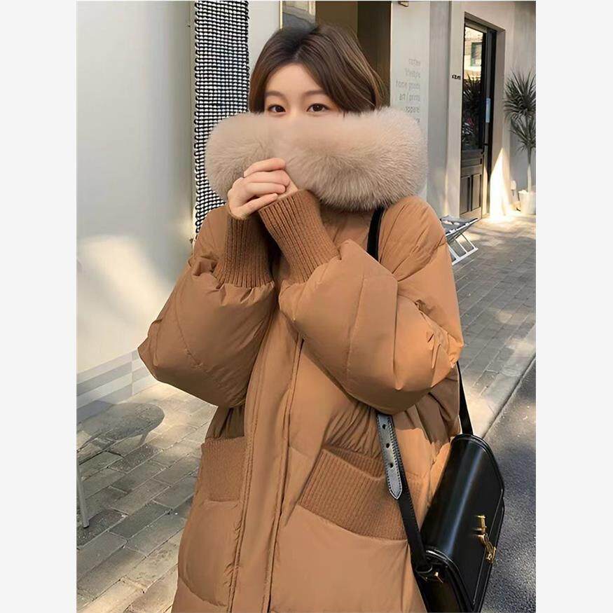 2025新款大毛领中长款连帽羽绒棉服过膝大口袋加厚冬棉衣女外套潮