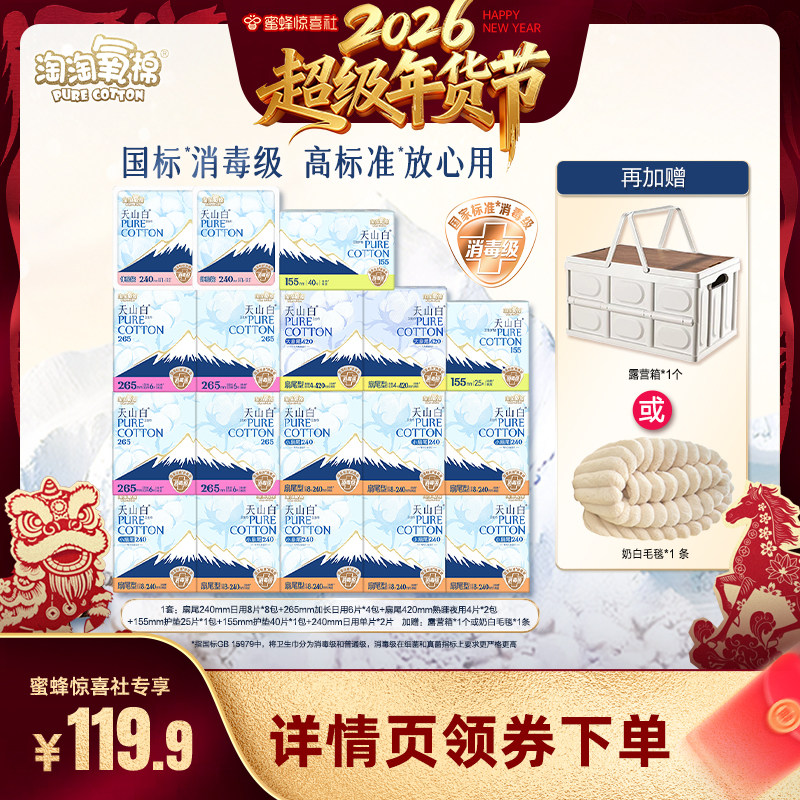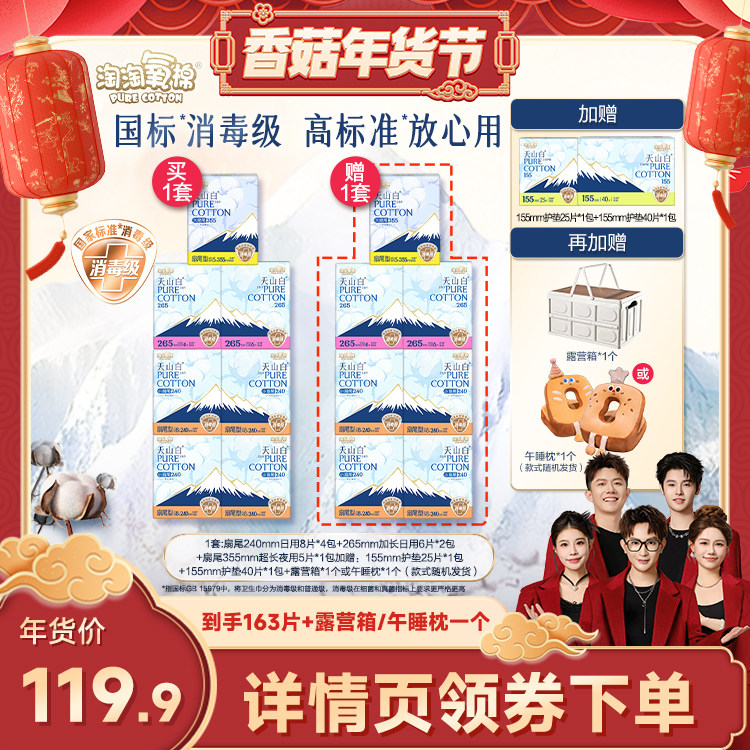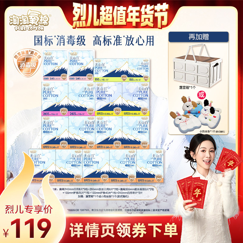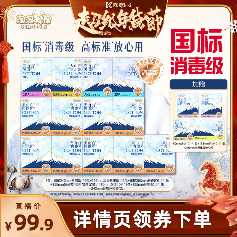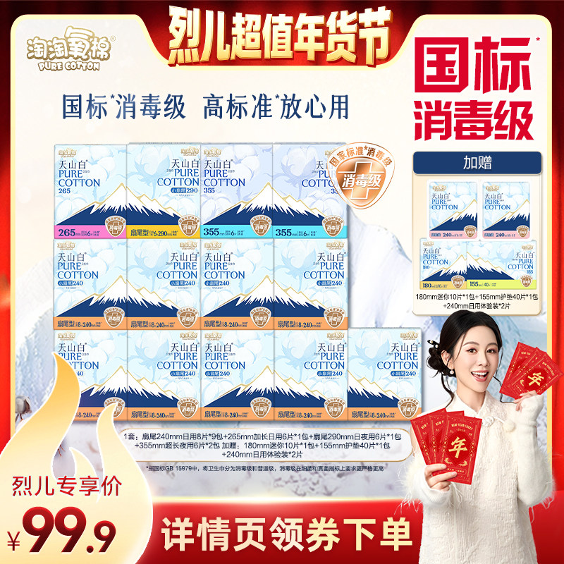 淘淘氧棉消毒级纯棉卫生巾天山白全周期日夜用组合姨妈巾官方正品