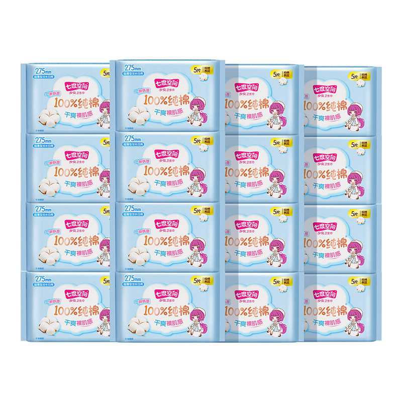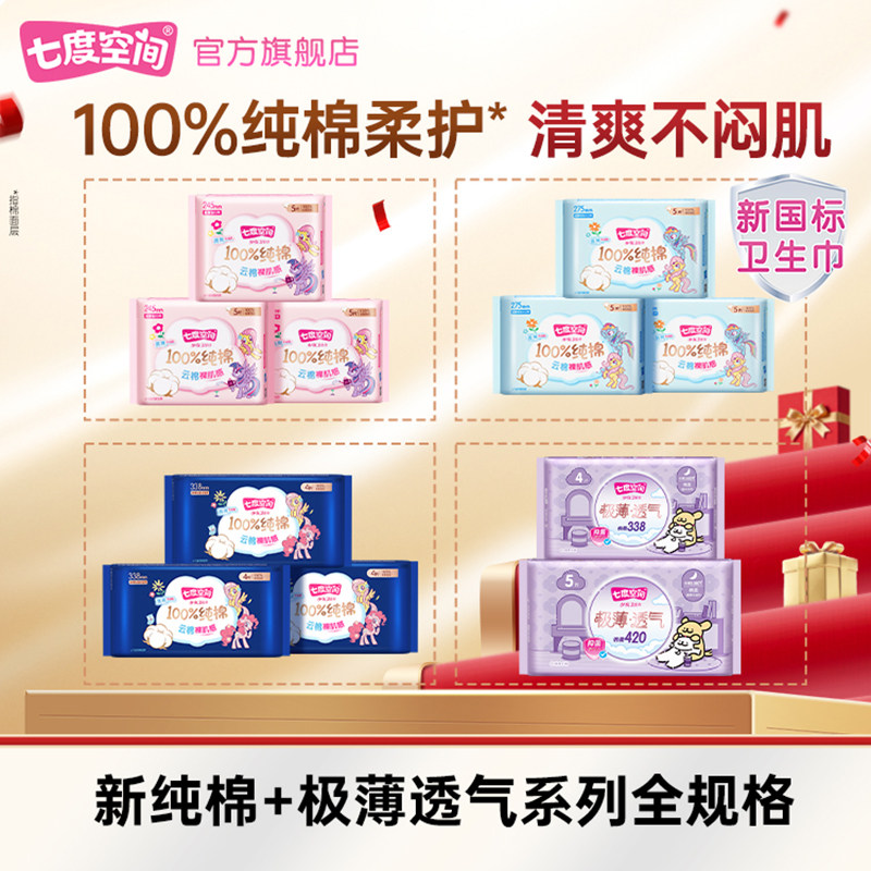 【新国标认证】七度空间少女纯棉卫生巾夜用275姨妈巾正品旗舰店