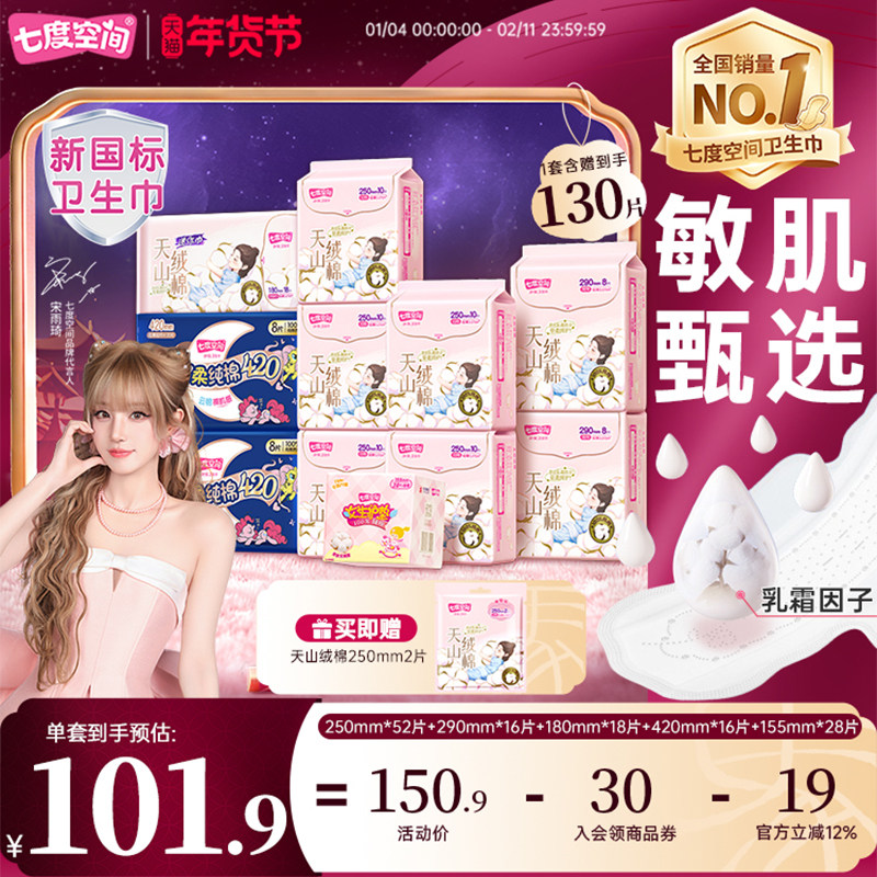 【新国标认证】七度空间天山绒棉100%纯棉卫生巾日夜姨妈巾极薄