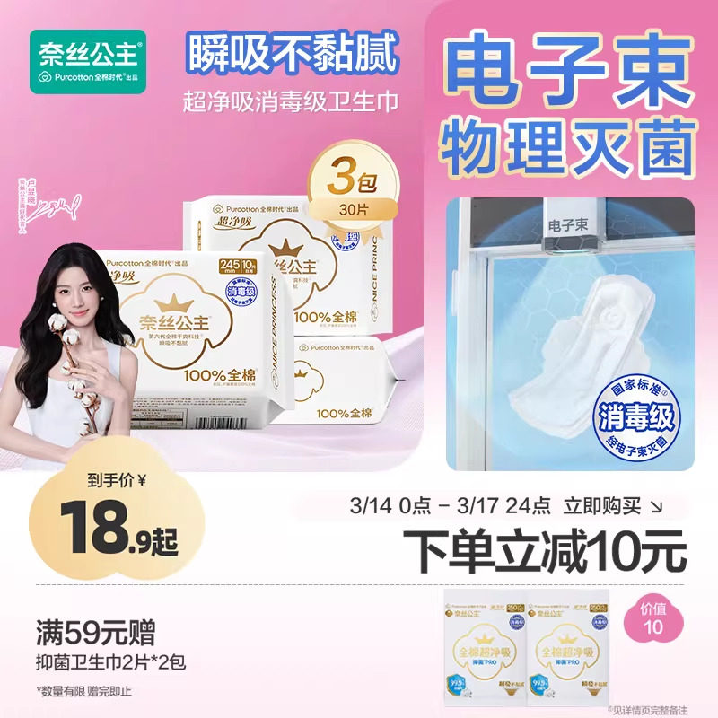 【代言人卢昱晓推荐】全棉时代奈丝公主纯棉卫生巾超净吸PRO抑菌