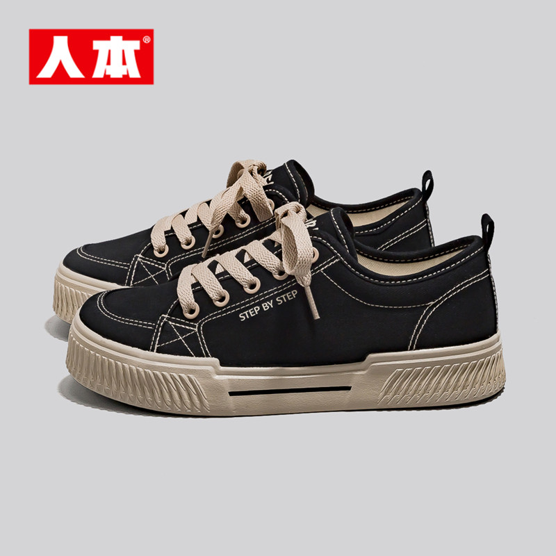 人本帆布鞋女2025新款平底黑色板鞋女学生ulzzang原宿风百搭女鞋