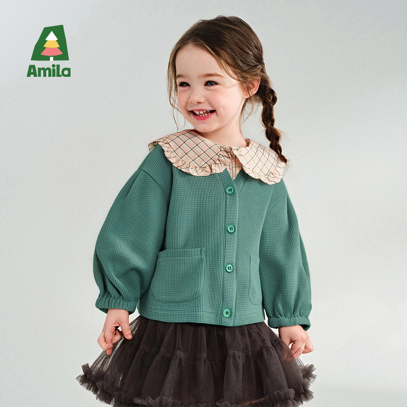 Amila童装春季新款女童休闲外套宝宝开衫华夫格儿童衬衫百搭甜美