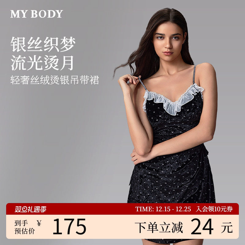 MYBODY商场同款秋季新款带胸垫荷叶边银丝优雅轻奢烫银丝绒吊带裙