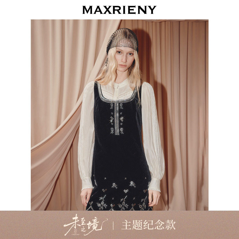【艺术系流浪】MAXRIENY法式复古收腰无袖连衣裙方领丝绒吊带裙秋