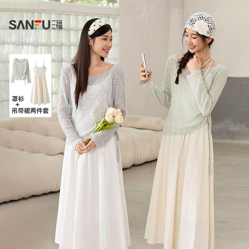 三福连衣裙套装2025新款早秋季气质吊带裙子罩衫两件套女装503624