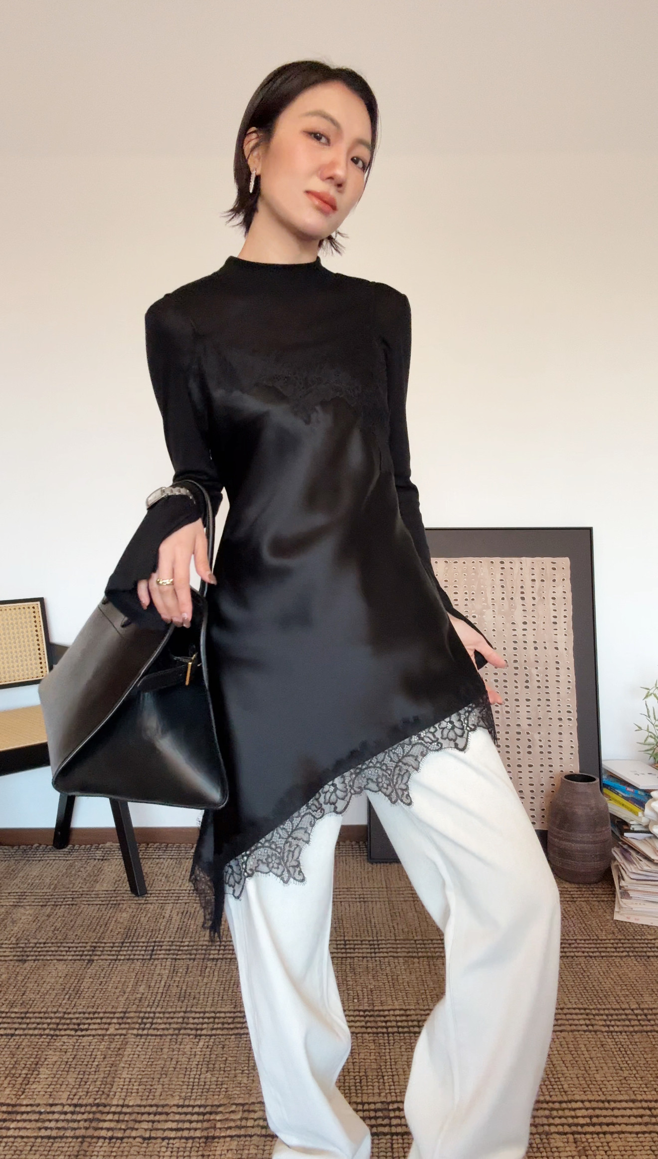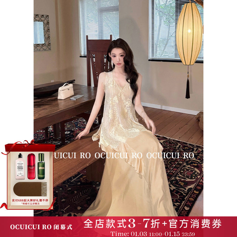 山阶【高审美叠穿】蕾丝不对称醋酸吊带裙小众设计独特缎面连衣裙