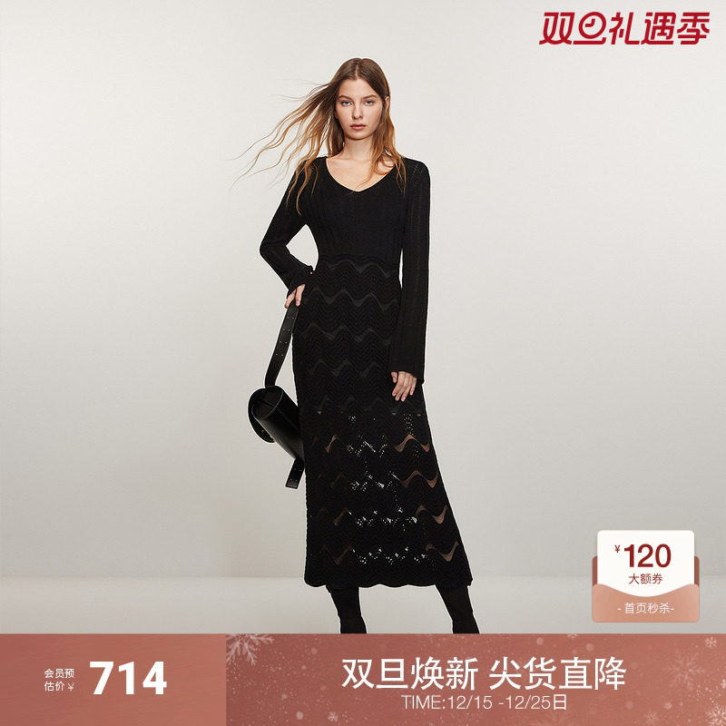 ochirly欧时力 V领镂空毛织连衣裙2024新款早春配吊带裙两件套