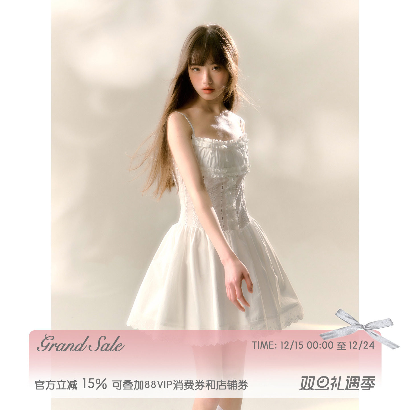 RECIT原创设计 南法度假风连衣裙女冬季蕾丝镂空芭蕾小众吊带裙子