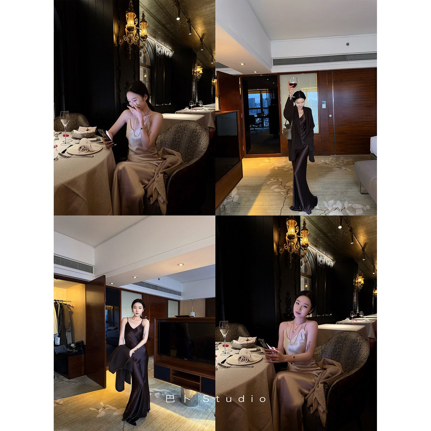 巴卜Studio 纯色v领缎面吊带裙优雅丝滑垂感包臀鱼尾长款连衣裙
