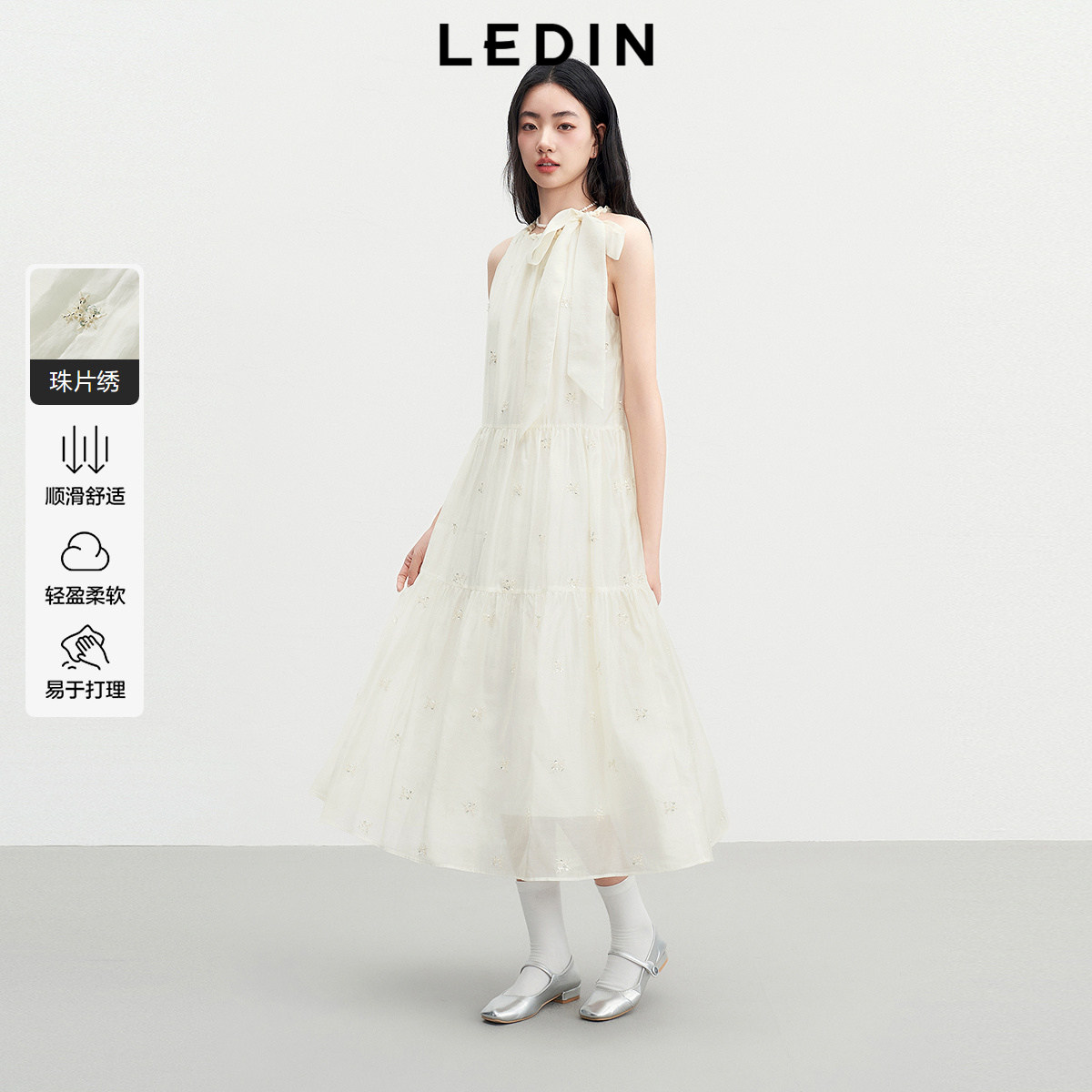 乐町重工绣花挂脖长裙夏新款编织领吊带裙可拆蝴蝶系带无袖连衣裙