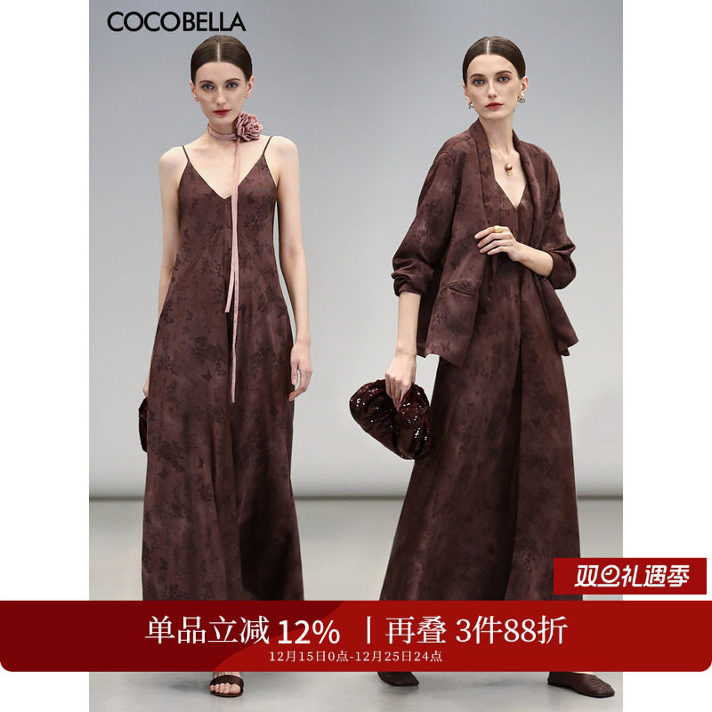COCOBELLA国风暗纹提花垂坠吊带裙气质V领新中式连衣裙FR0059