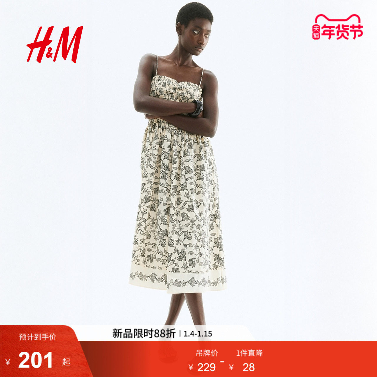 HM女装连衣裙春季可拆卸肩带抹胸缩褶碎花度假印花吊带裙1217947