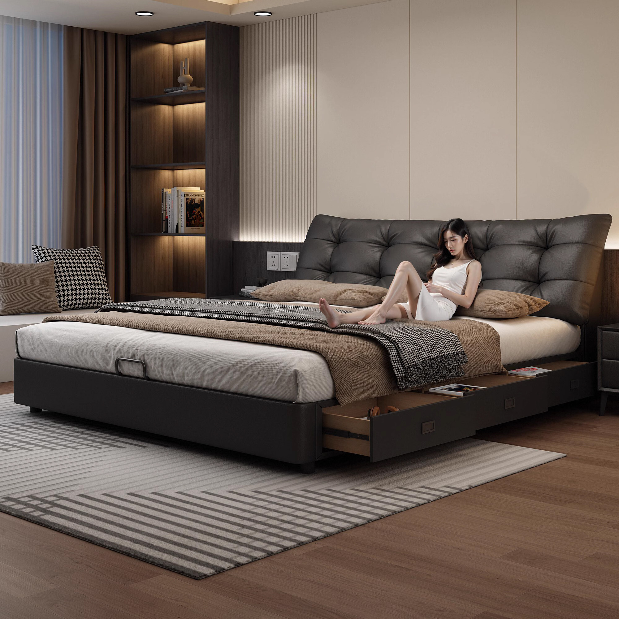 政府补贴佐慕真皮床三抽主卧意式极简黑色轻奢小户型双人床储物床