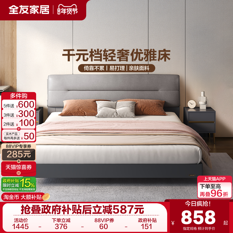 全友家居现代轻奢科技布艺床主卧室家具1米8双人床储物软包大床