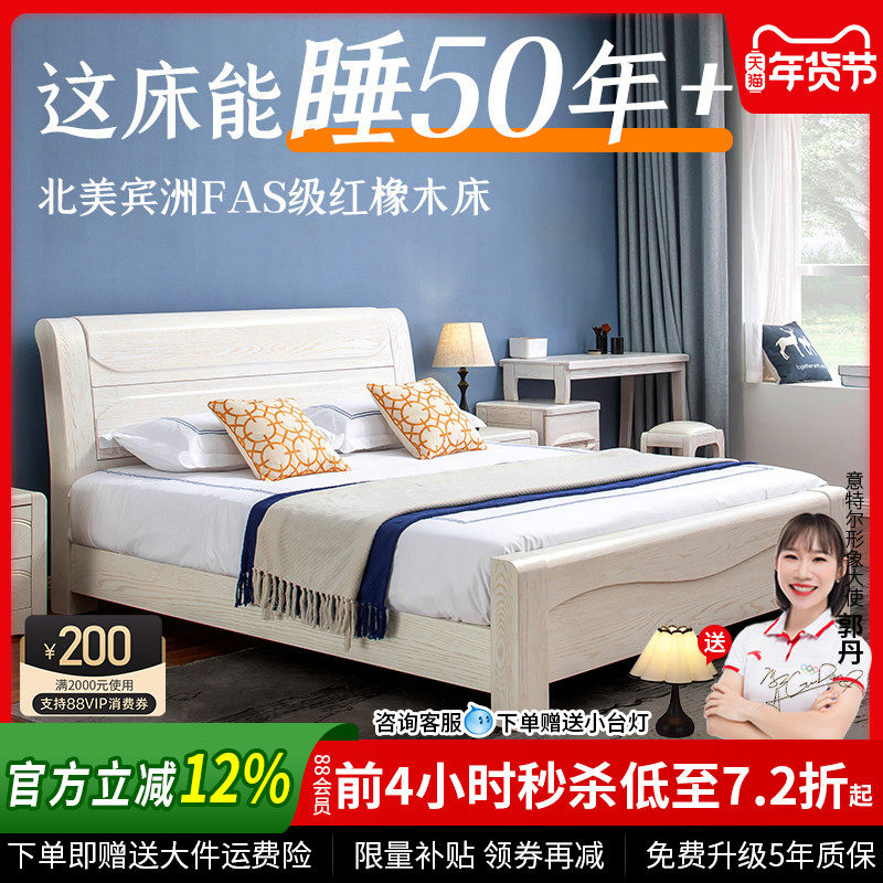 加厚全实木床白色橡木床现代简约2米大床主卧高档1.8米双人床储物