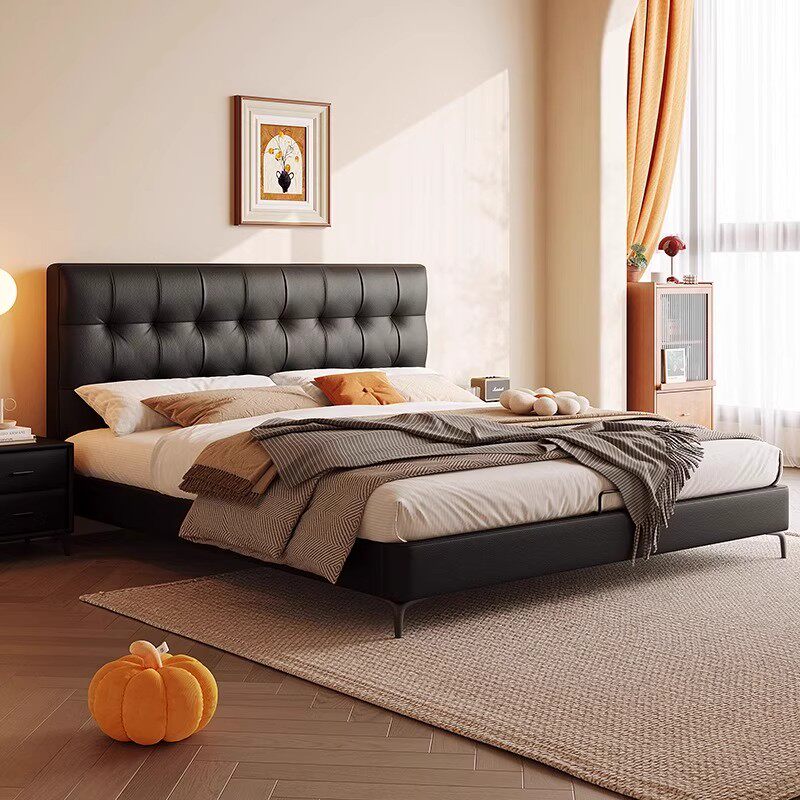 现代简约真皮床超薄床头极简主卧小户型双人床储物床网红款出租房