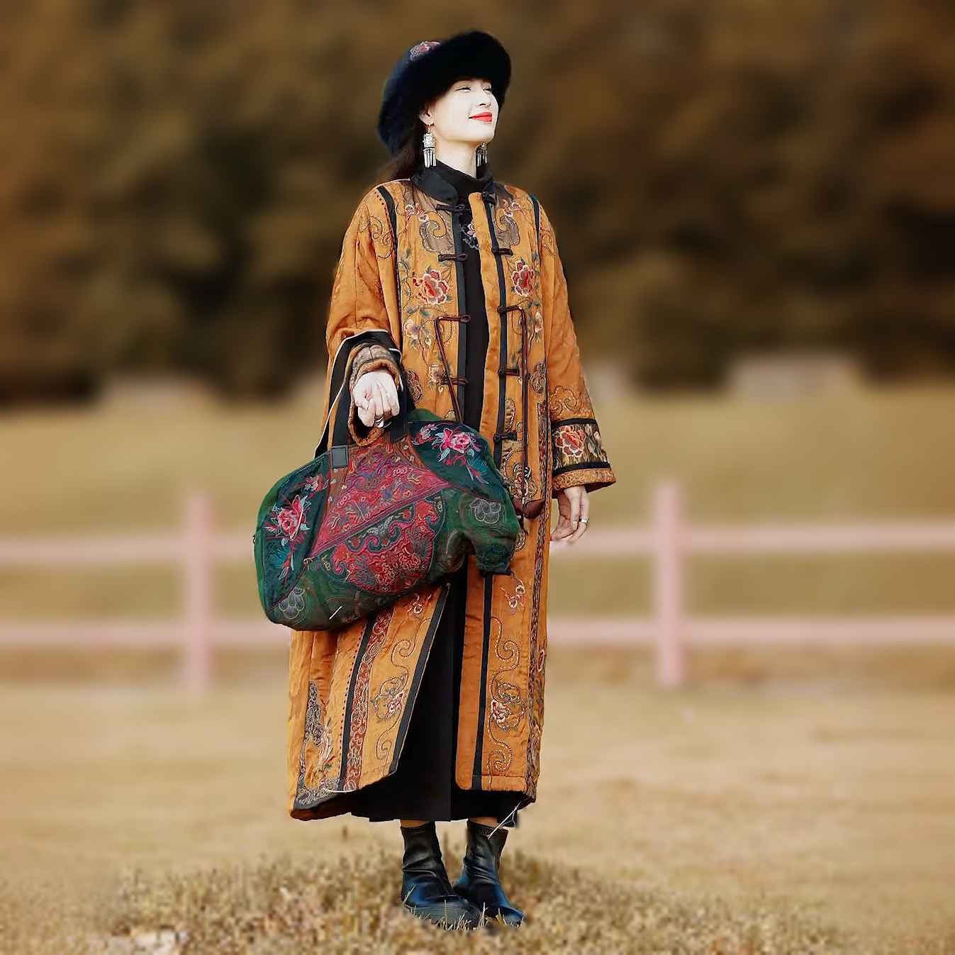 2025年冬季新款民族风刺绣过膝长款棉衣棉服兔毛领棉袄大衣外套女