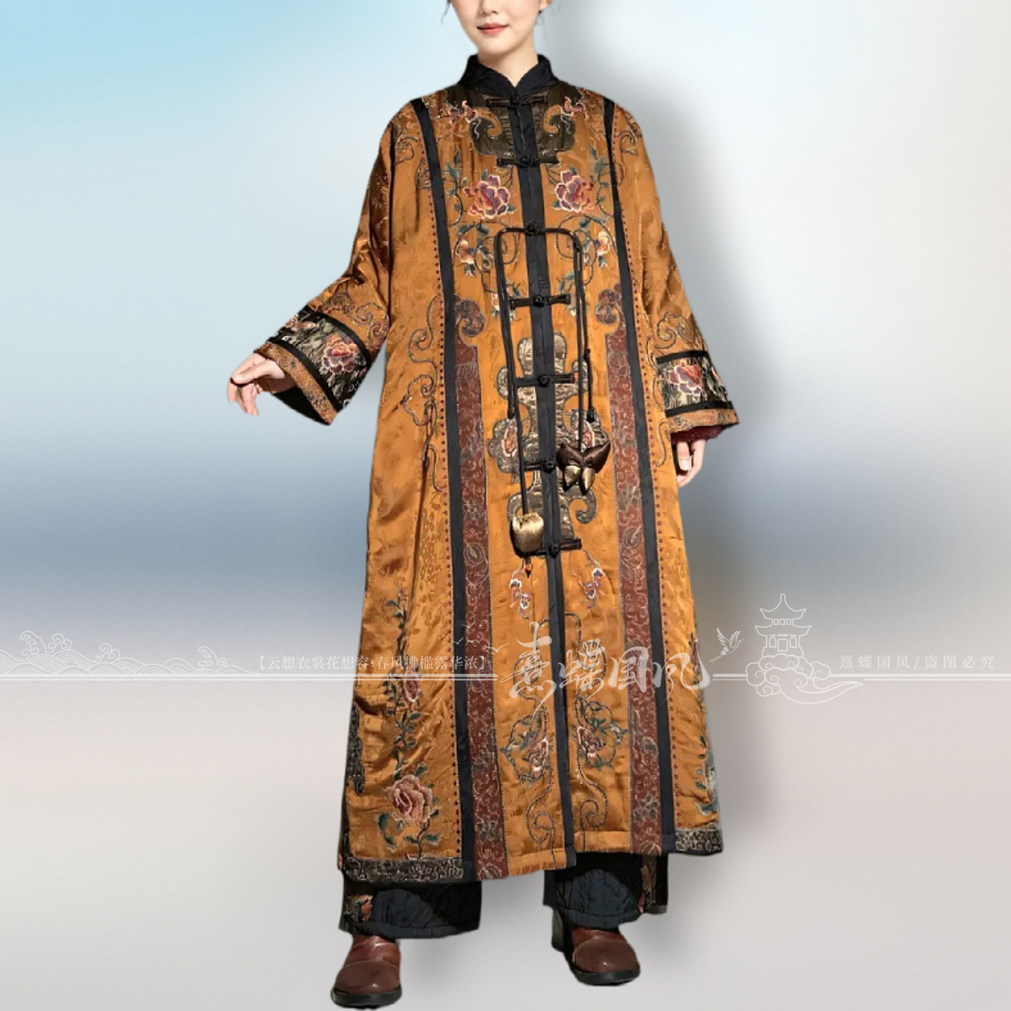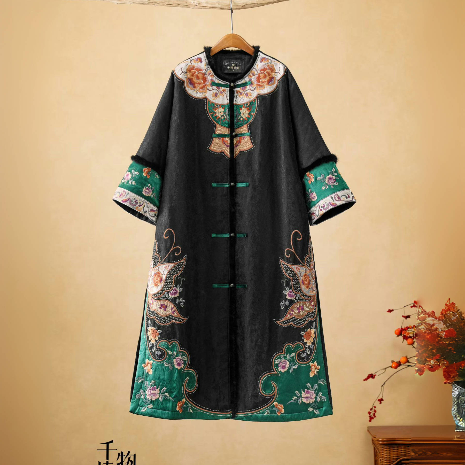 千椿物喜原创民族风新中式国风文艺刺绣夹棉长款风衣外套棉衣棉服