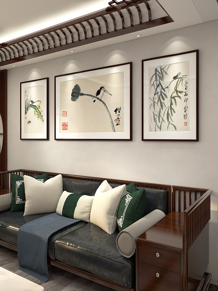 网红客厅装饰画三联画新中式壁画沙发背景画红木国画中国风齐白石