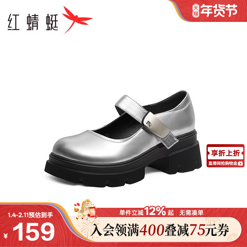 红蜻蜓银色玛丽珍鞋新款厚底女鞋复古松糕单鞋粗跟增高学院小皮鞋