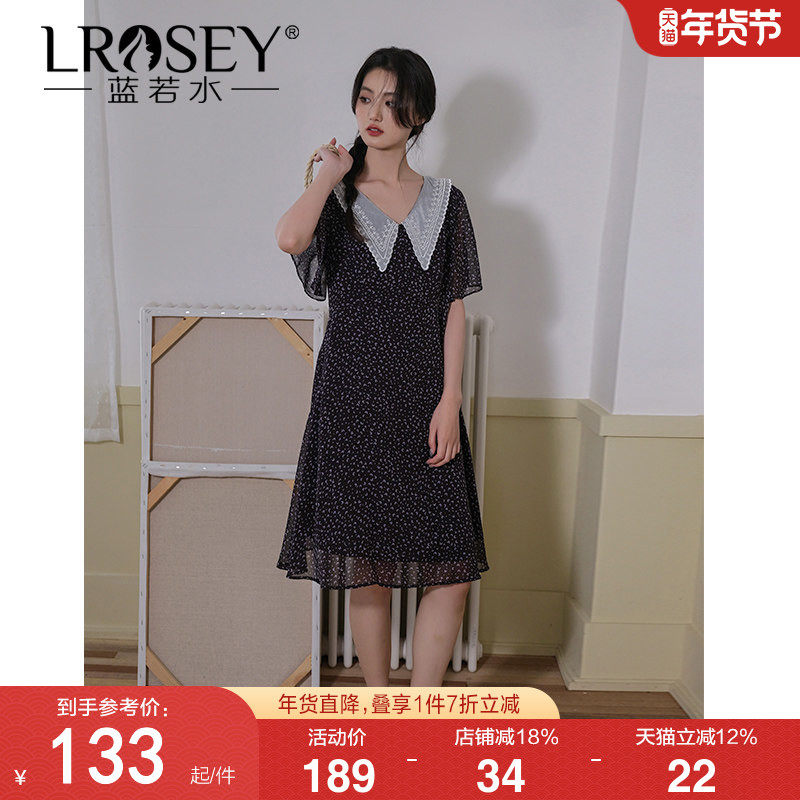 蓝若水大码女装胖mm蕾丝翻领碎花连衣裙夏季新品显瘦雪纺淑女中裙