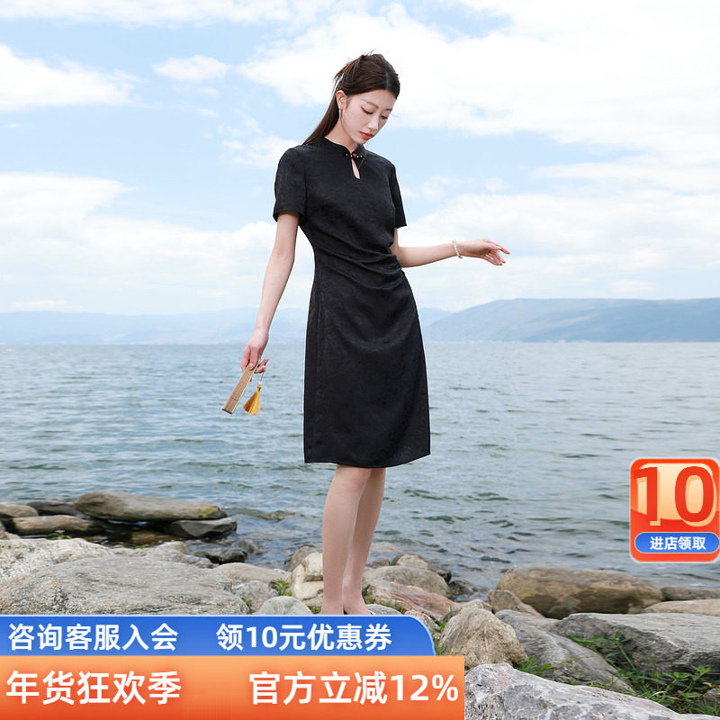 若潮大码女装2025夏季新款国风旗袍连衣裙中裙立领提花胖MM