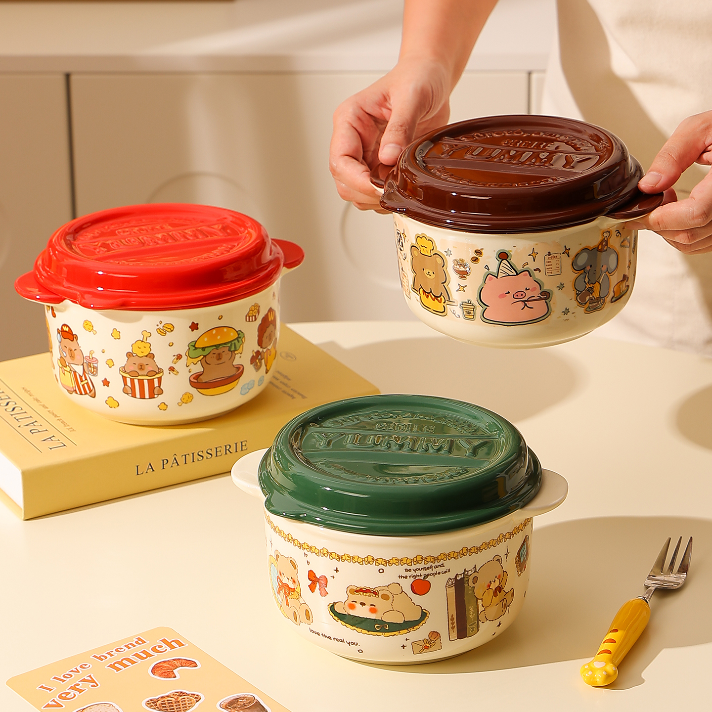 卡通可爱泡面碗家用大容量陶瓷碗高颜值宿舍带盖面碗一人食汤面碗