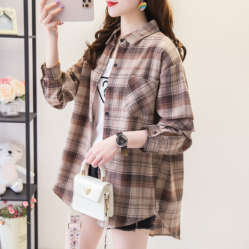 复古格子衬衫 女春秋宽松外套小个子长袖纯棉磨毛韩版大码女上衣