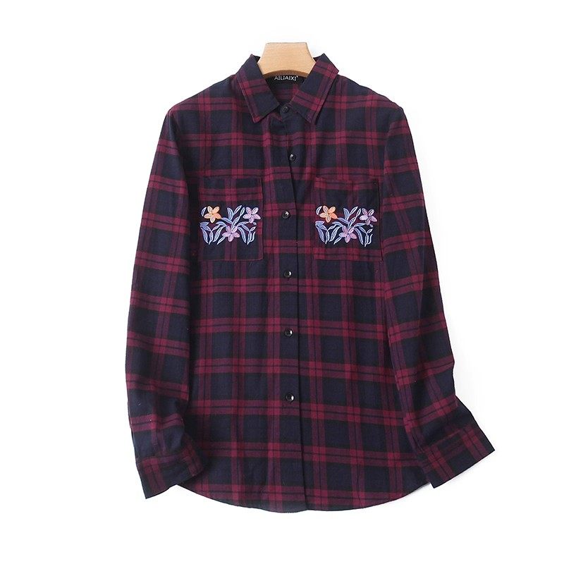 刺绣格子衬衫 女秋装新款休闲宽松翻领上衣 长袖衬衣打底衫 10382