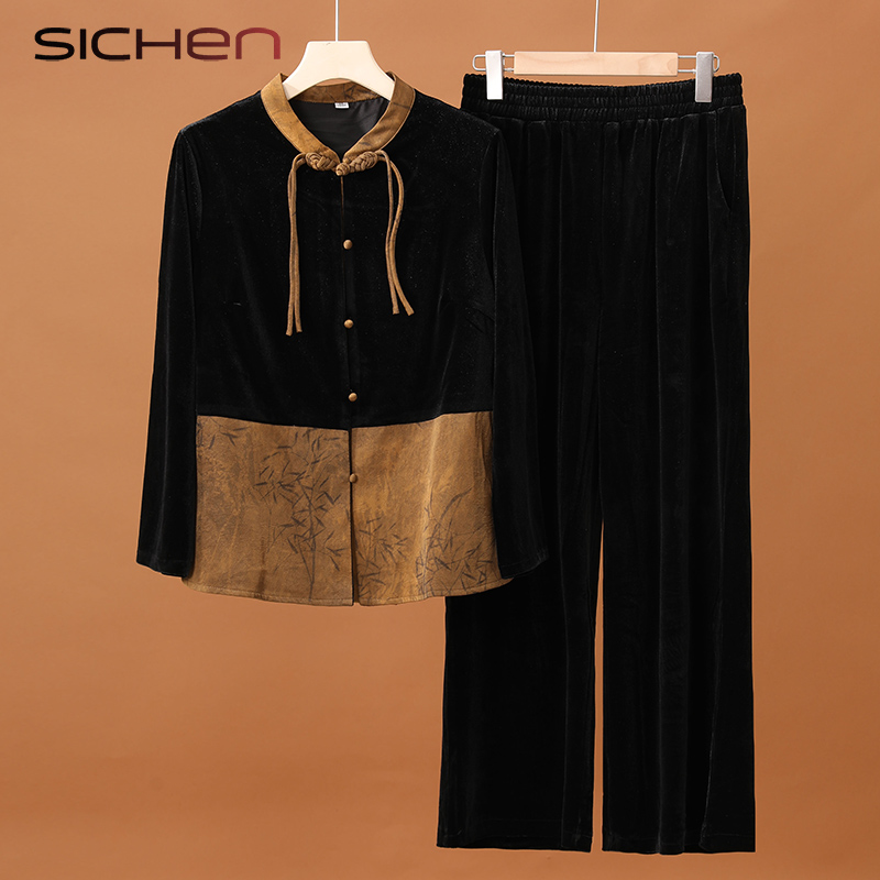 中年妈妈秋装中式国风金丝绒套装中老年女装外套春秋季外搭两件套