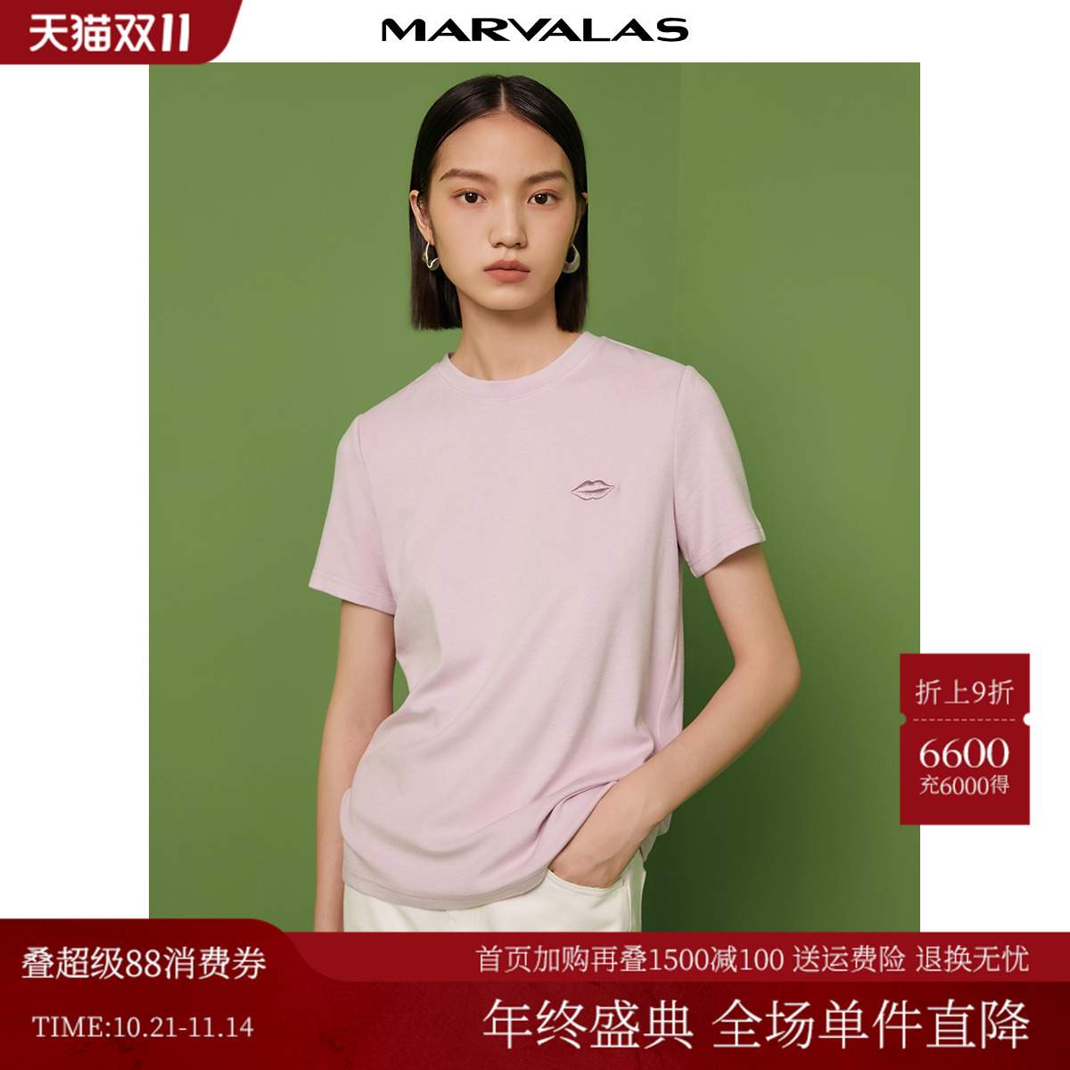 曼德诗简约短袖女2025秋造型感立体绣花T恤绒感圆领套头内搭上衣