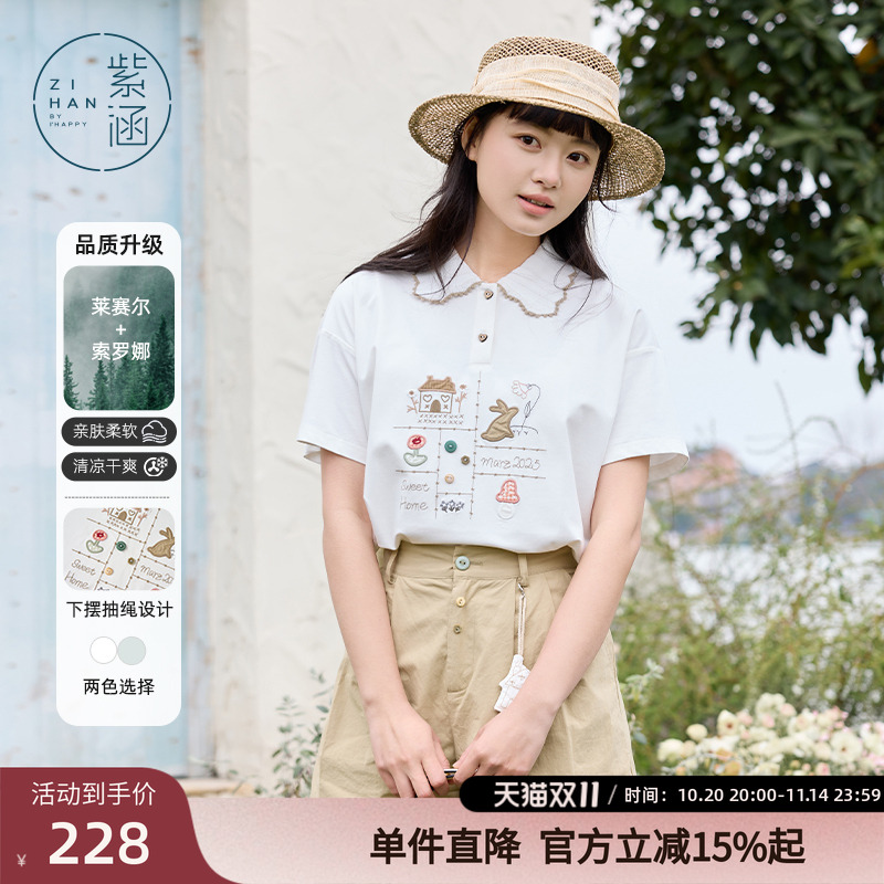 紫涵polo领贴布绣花T恤女2025年夏季新款设计感减龄宽松短袖上衣