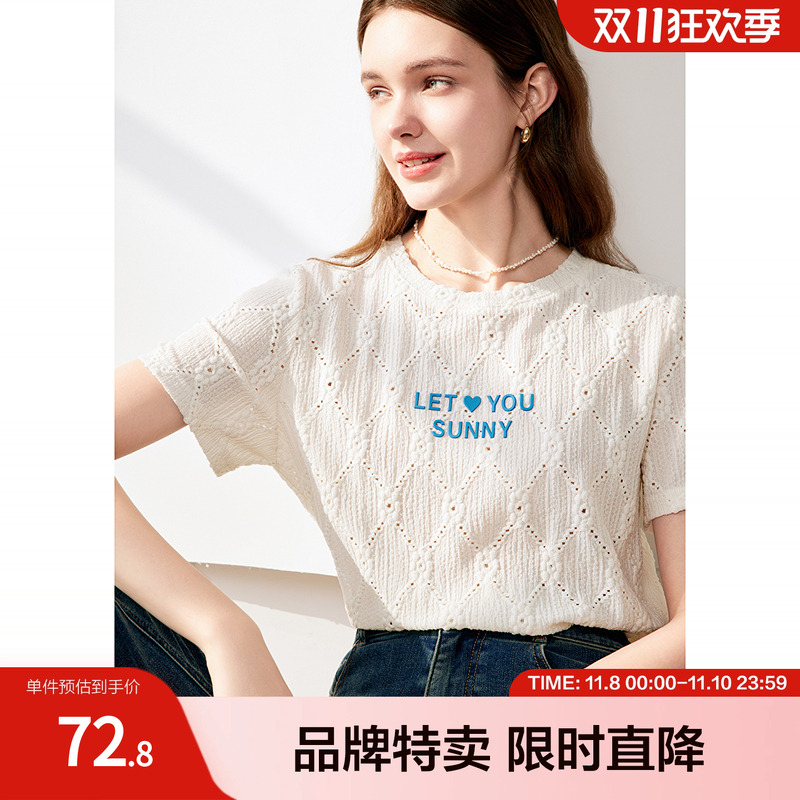 Amii2025夏新款极简通勤纯色宽松连肩短袖套头圆领镂空绣花T恤女