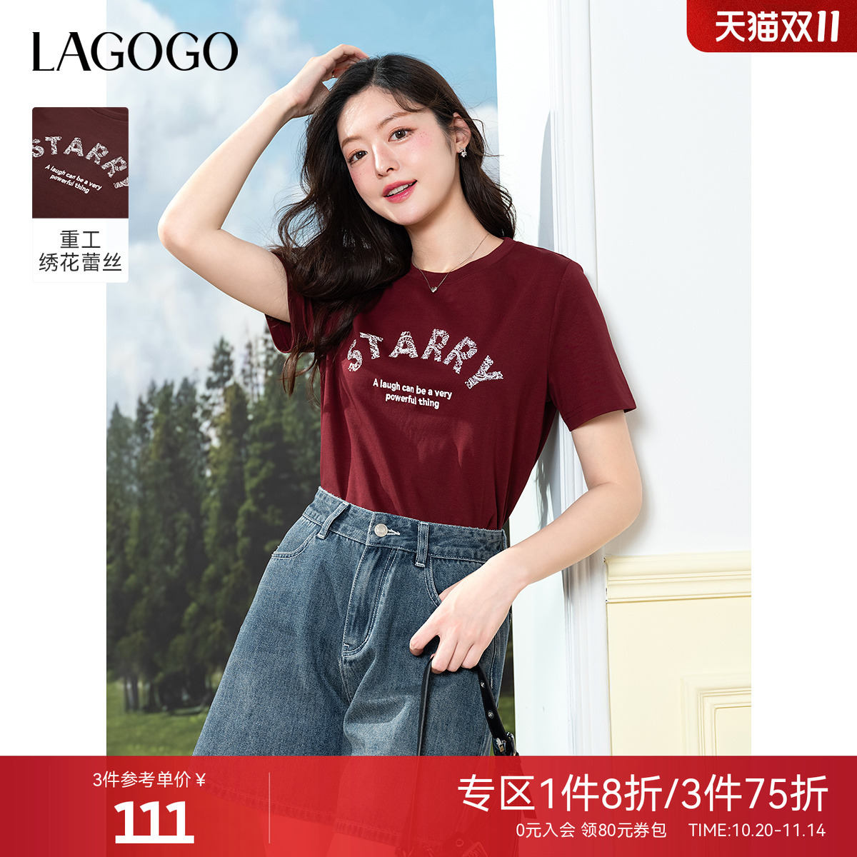 LAGOGO酒红色蕾丝绣花T恤女拉谷谷2025年夏新款纯棉通勤短袖上衣