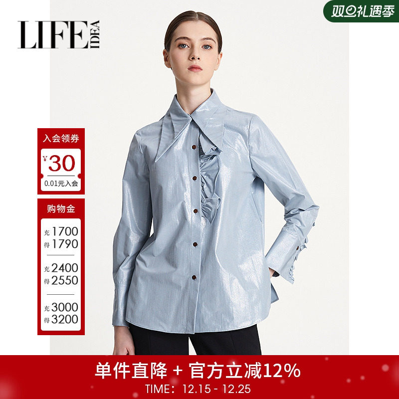 莱芙艾迪儿品牌翻领荷叶边设计衬衫春秋新款女装复古优雅气质衬衣