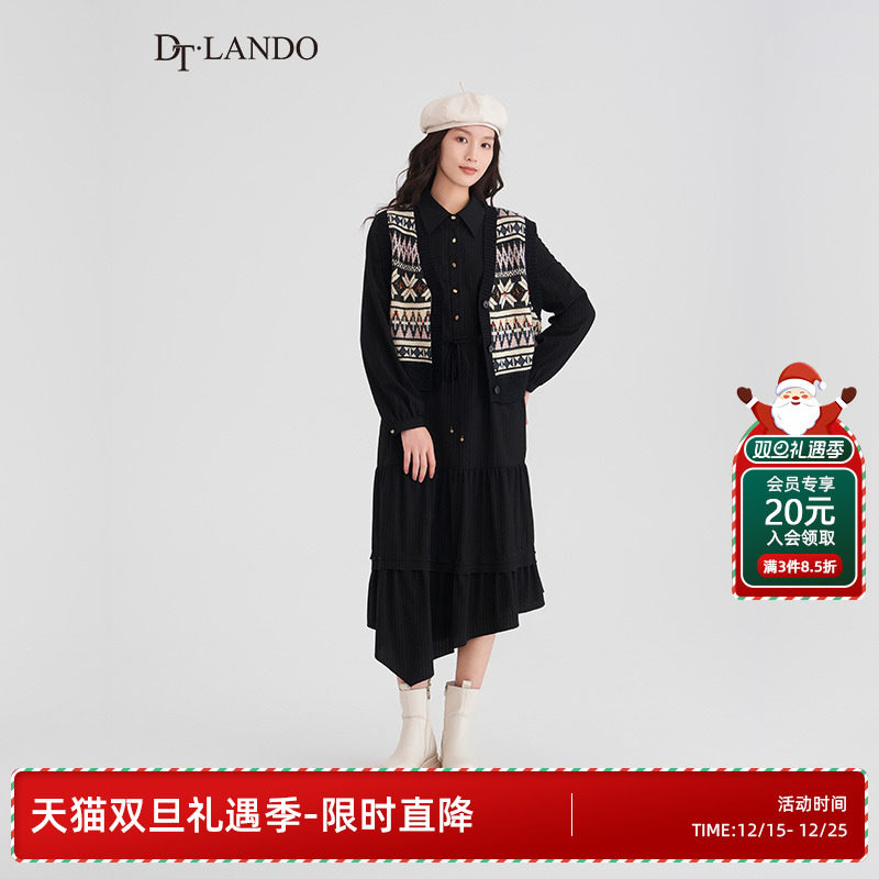 DTLANDO品牌女装衬衫裙秋季复古不规则设计感黑色翻领连衣裙裙子