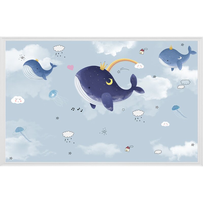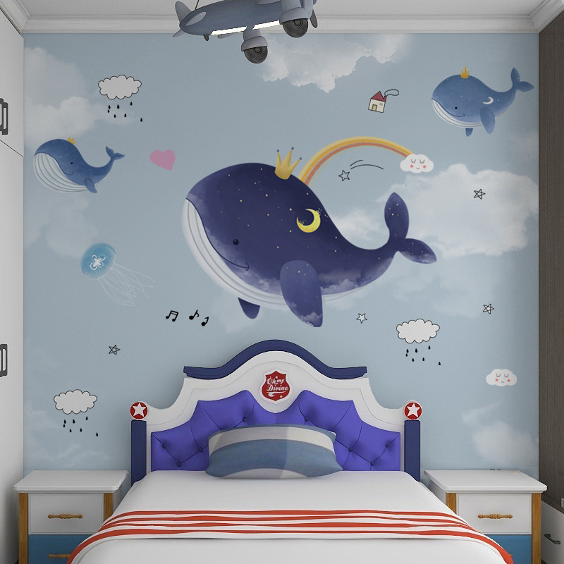 儿童房墙纸男孩壁纸卡通星空卧室墙布鲸鱼定制背景墙蓝天白云壁布