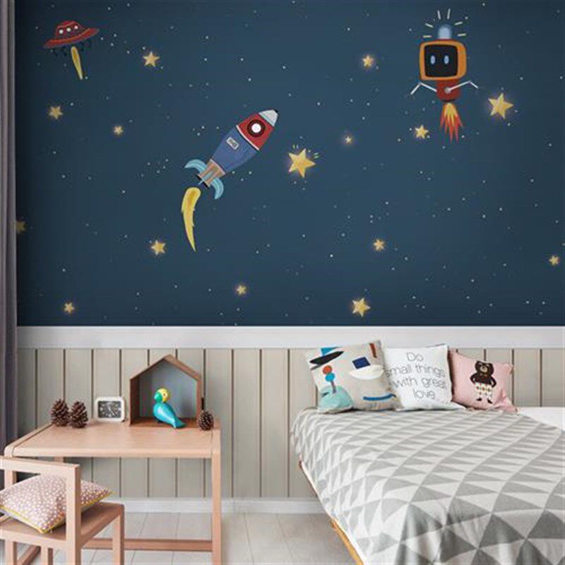 男孩卧室火箭壁纸浅蓝色卡通星空墙纸儿童房床头墙布环保定制壁画