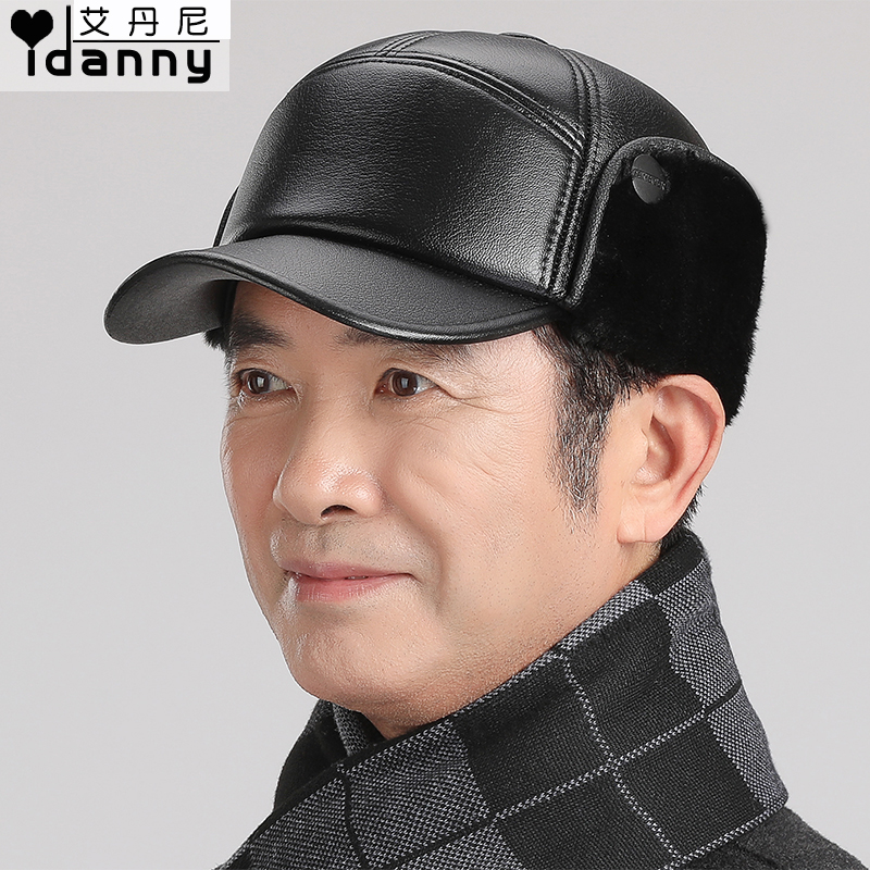 秋冬季真皮平顶帽男士中老年人保暖护耳棉帽中年爸爸牛皮帽子冬天