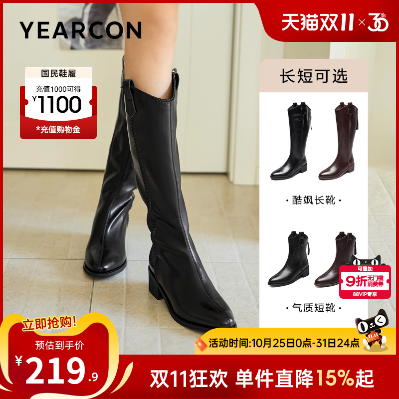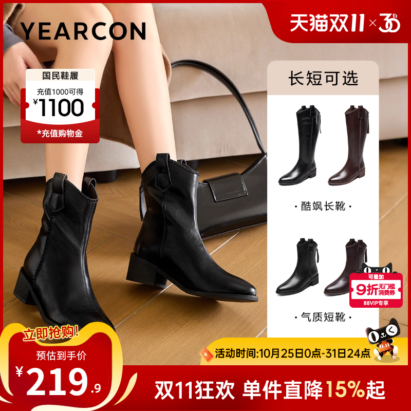 意尔康女鞋2025冬季单靴V口短靴法式气质显瘦复古西部靴迪木尔风