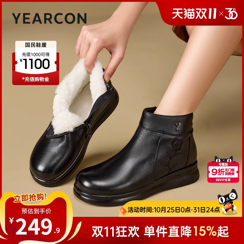 意尔康女鞋冬季靴子短靴真皮短筒皮靴中老年妈妈棉鞋加绒保暖女靴