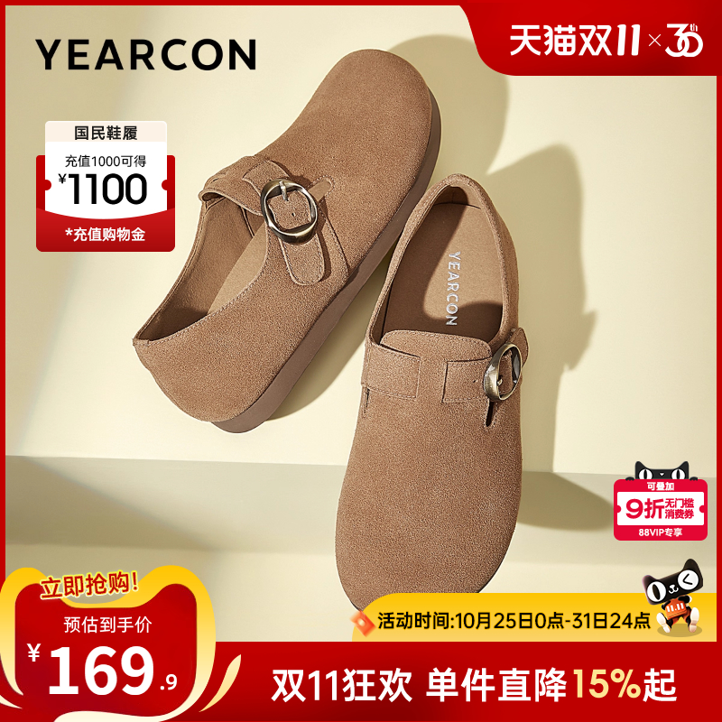 意尔康女鞋2025秋季一脚蹬全包勃肯鞋复古软底乐福鞋平底包头单鞋